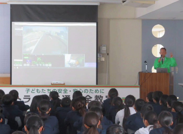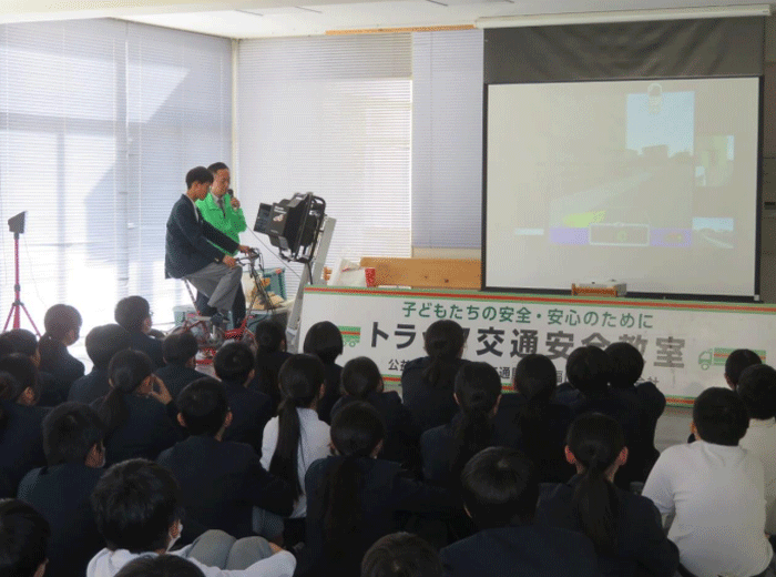 福山通運と小丸交通財団は12月5日、広島県の府中市立第一中学校において、1年生117名を対象に交通安全教室を開催した。