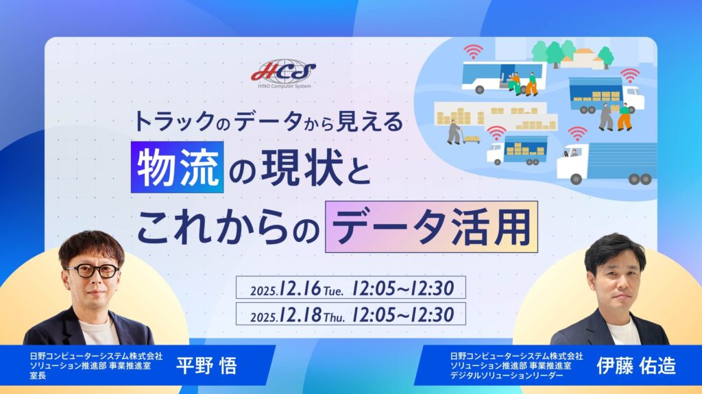 日野自動車のITソリューションカンパニーである日野コンピューターシステムは12月16日・18日の2日間、ウェビナー「トラックのデータから見える物流の現状とこれからのデータ活用」を開催する。