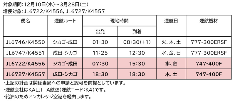 JALは12月10日から、米国KALITTA航空と成田ーシカゴで実施している定期貨物便のコードシェア運航を増便し、週5便で運航する。