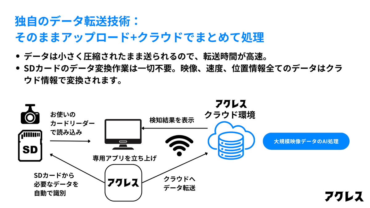 アクレスは、カメラ角度を問わず、横からの映像や夜間の暗所、低画質(30万画素)の映像でも高精度に検知。専用ハードウェアを入れずに既設デジタコ・ドラレコの映像・走行データから自動検知が可能となっている。