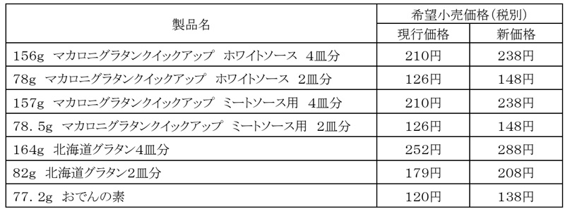 「マカロニグラタンクイックアップホワイトソース4皿分」が210円から238円に、「おでんの素」は120円から138円に上がる。