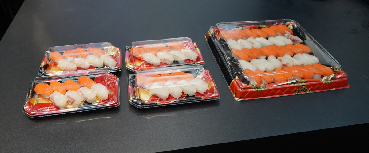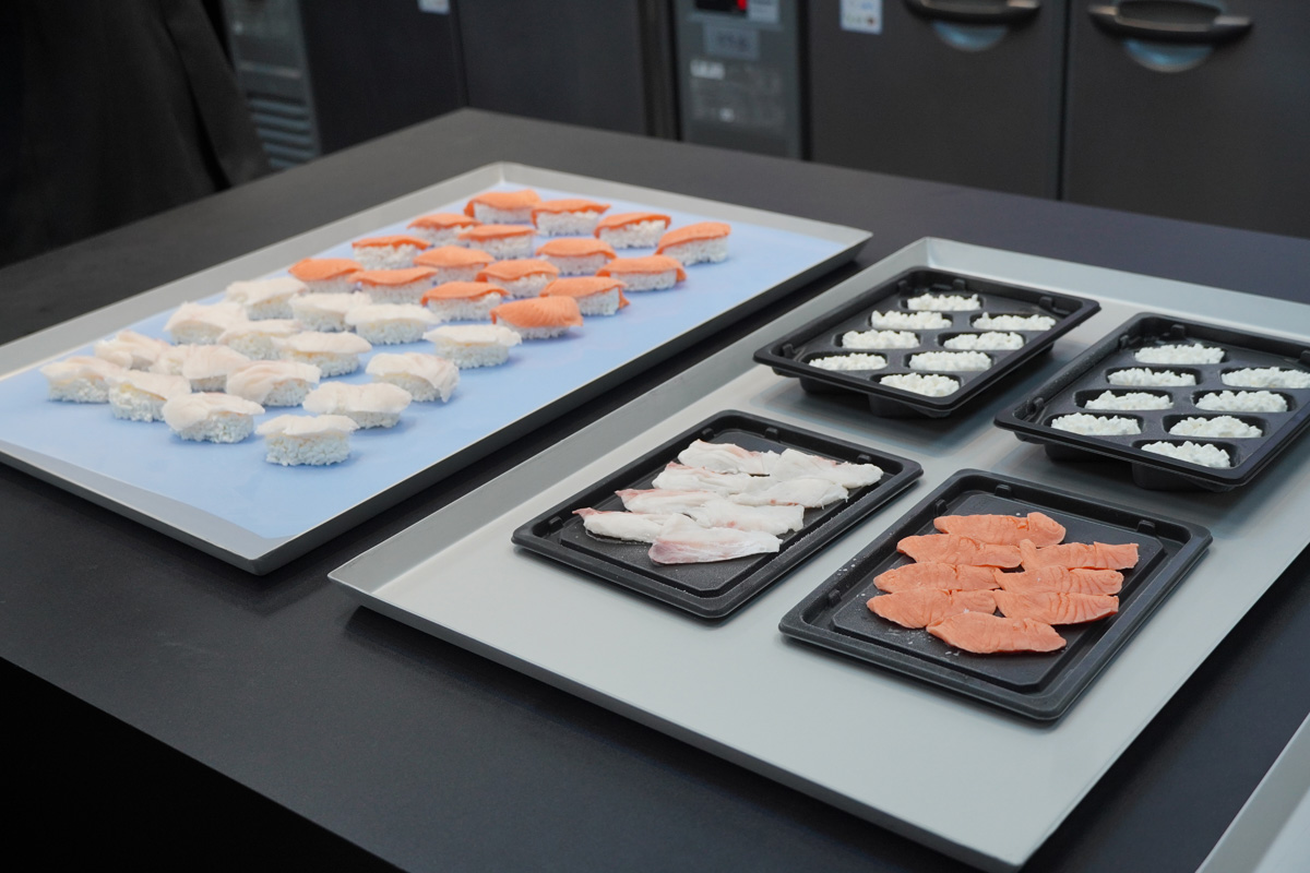 デモンストレーションでは、寿司ロボットで製造したシャリとネタを合わせて凍結したほか、解凍した寿司の試食提供が行われた。