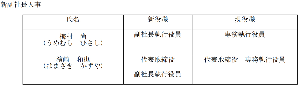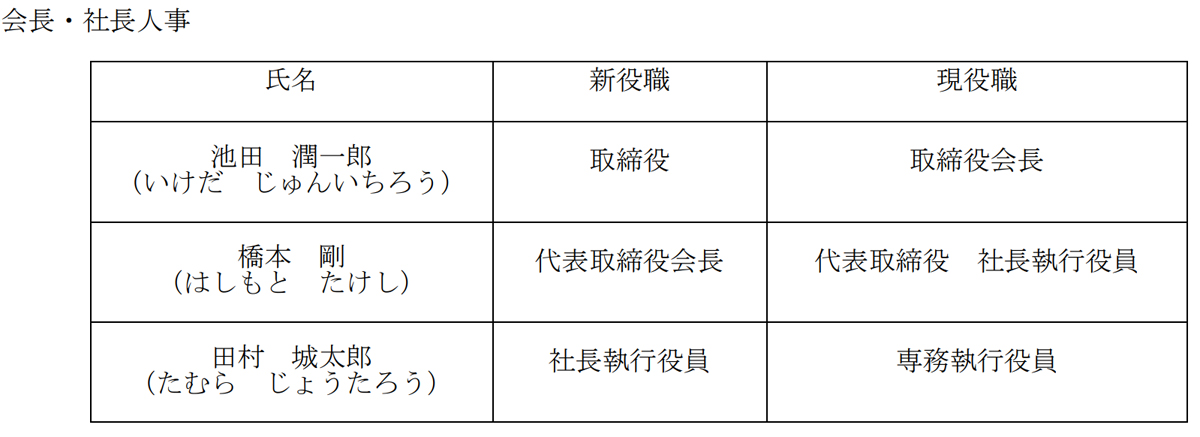 池田 潤一郎 取締役会長は2026年4月1日付で取締役となった上で、6月25日開催予定の定時株主総会終了時に取締役を退任し特別顧問に就任する予定。また、橋本 会長は2026年6月25日開催予定の定時株主総会と終了後の取締役会の決議を経て代表権のない取締役会長に、田村 社長と梅村 副社長は代表取締役に就任する予定となっている。