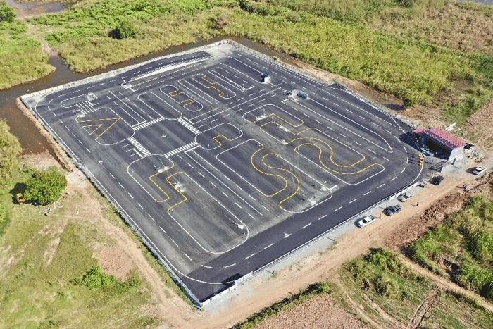 開設した教習コースは、「日本の教習所を現地に丸ごと再現」したもの。坂道、S字、クランクといった課題走行に対応する設備を備えるとともに、コース内には日本の道路標識も設置し、日本の教習所の物的基準を満たす構成となっている。