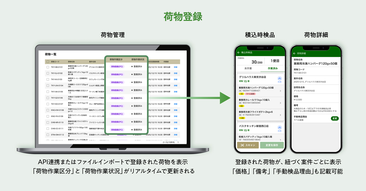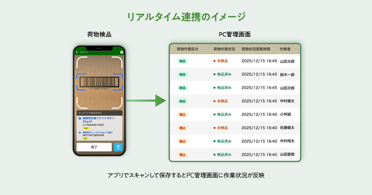 またAPI連携とPC管理画面で、管理者は荷物が「未検品」か「検品済み」かリアルタイムに把握できる。ドライバーに電話確認する手間がなくなり、トラブル発生時も迅速に原因特定と対応ができるようになる。