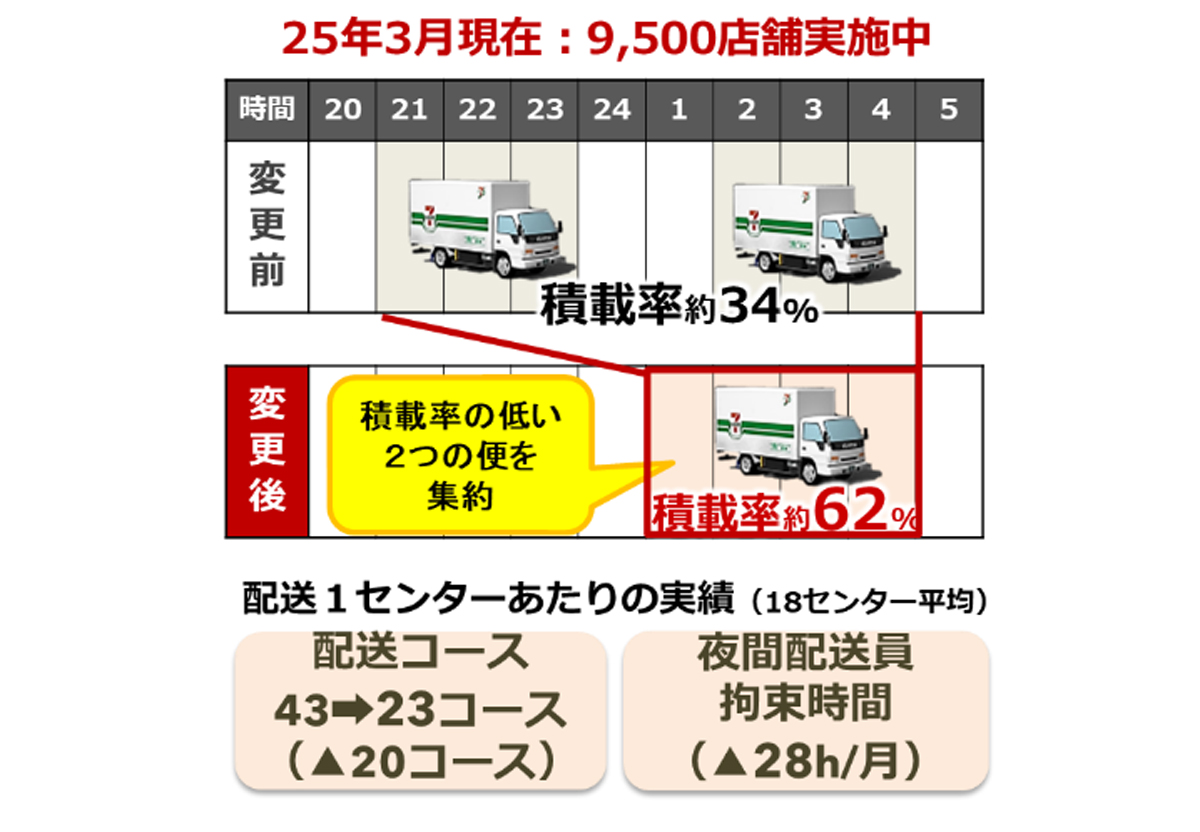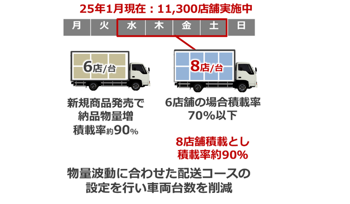 効率化の一環として、おにぎりやサンドイッチといった日配品において、夜間納品便を集約することで、積載率と配送員の拘束時間を改善。2025年3月時点で、9500店舗で実施している。