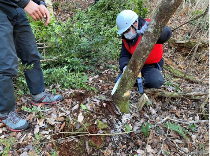 役員や従業員24人が参加し里山林の整備活動を行い、豊かな自然環境の中、指導員の監督のもと常緑樹の間伐作業などに取り組んだ。