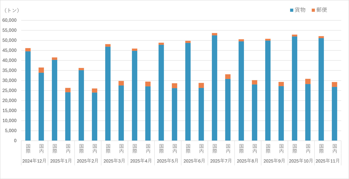 日本航空(JAL)が12月26日に公表した11月のグループ貨物郵便輸送実績によると、国際貨物は5万1128トン(前年同月比11.8%増)、国際郵便は974トン(24.8%減)となった。