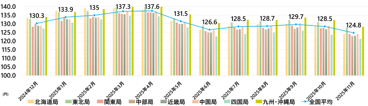 資源エネルギー庁が12月26日に公表した11月の軽油インタンク納入価格は、1リットル当たりの全国平均が124.8円(前月比3.7円減)となった。