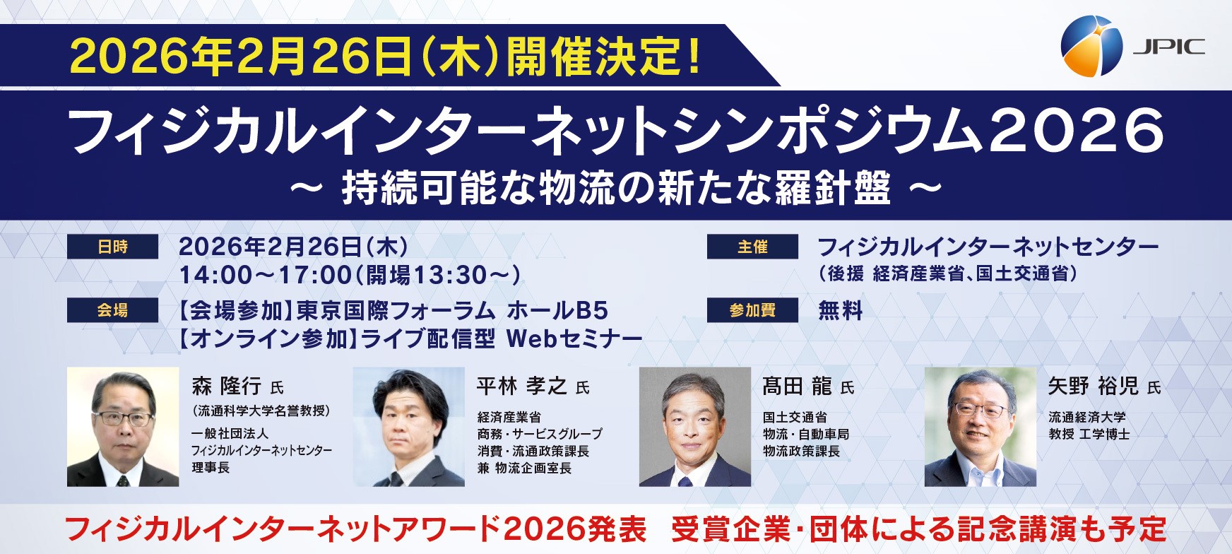 フィジカルインターネットセンター(JPIC)は2月26日、東京国際フォーラムとオンラインで「フィジカルインターネットシンポジウム2026」をハイブリッド開催する。
