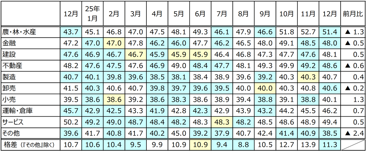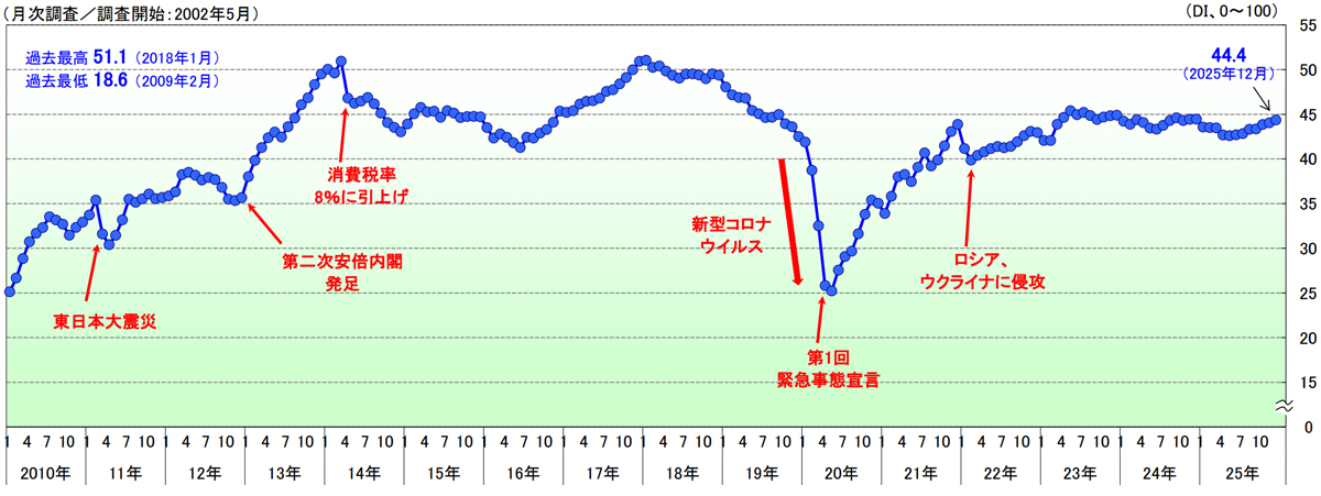 それによると、2025年12月の景気DIは前月比0.3ポイント増の44.4となり、2017年12月以来8年ぶりに7か月連続で改善した。