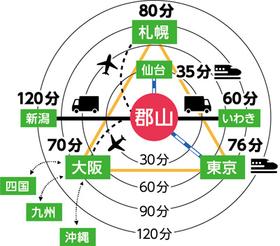 福田 はい。IC直結であり、さらに高規格道路で磐越自動車道に接続すると、西は新潟経由で大阪に行ける。東はいわき市につながり、小名浜港がある。磐越自動車道を活用することで、常磐自動車道、東北自動車道、関越自動車道、上信越自動車道と、4つの高速道路で、首都圏ともつながります。