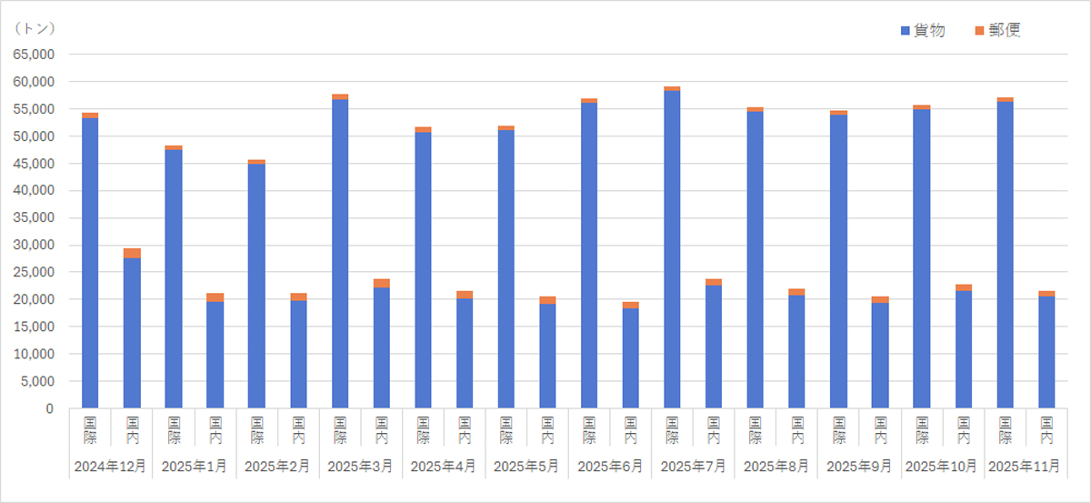 ANAグループが1月9日に発表した2025年11月のグループ実績によると、貨物・郵便輸送実績は、国際線の貨物重量が5万6322.3トン(前年同月比4.5%増)、郵便重量が829.7トン(20.3%減)となった。