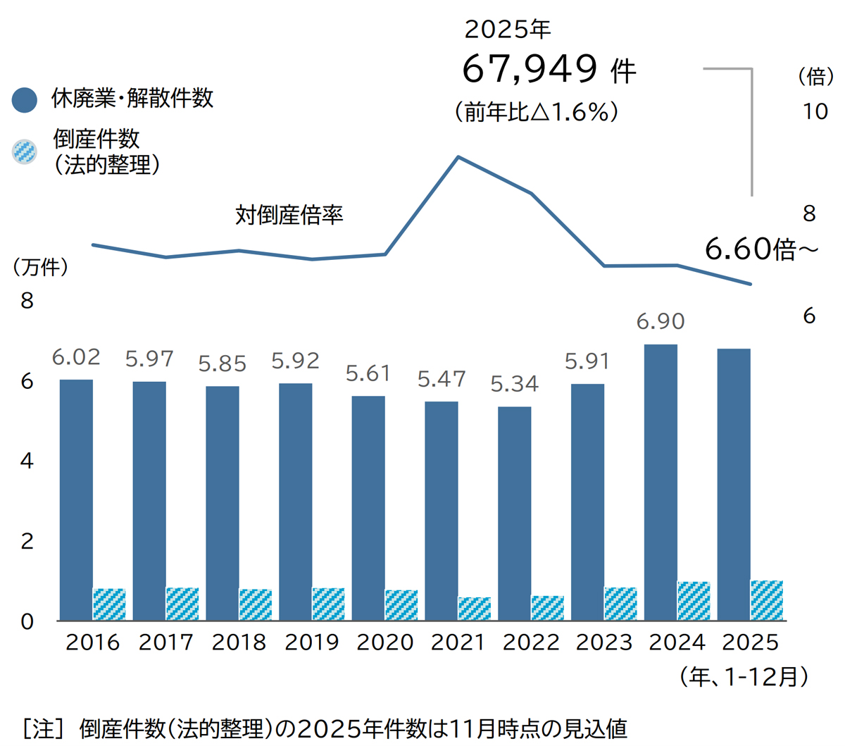 これによると、同期間で休廃業、解散を行った国内の企業は6万7949件。年間最多だった2024年の6万9019件と比較して1.6%減となり、3年ぶりに前年を下回りはしたものの、過去10年で2番目に多い水準となった。