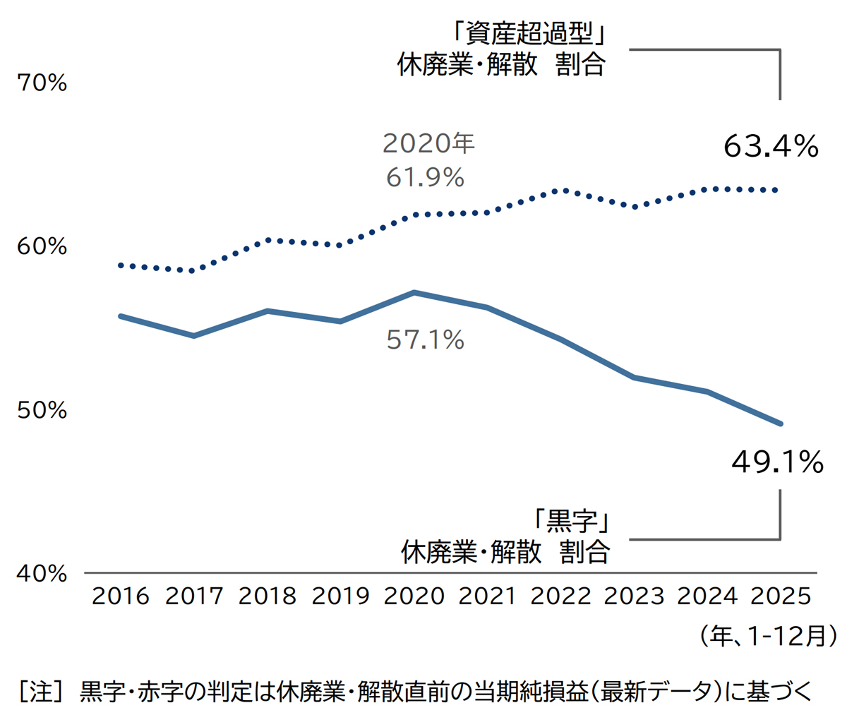 また、同期間に休廃業となった企業のうち、保有資産の総額が債務を上回る「資産超過型」の休廃業が占める割合は、63.4%となり、2年ぶりに前年を下回った。