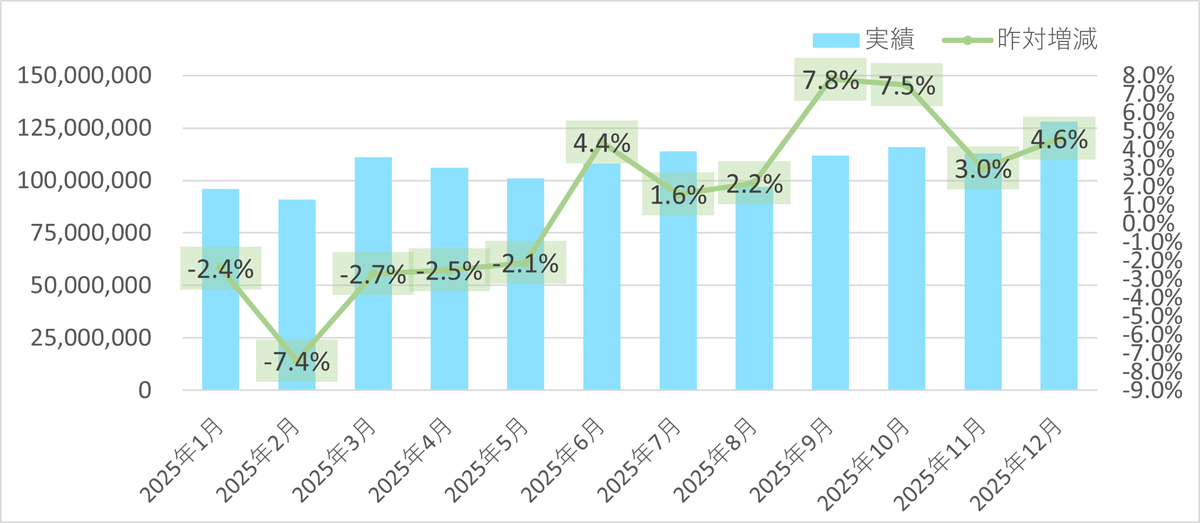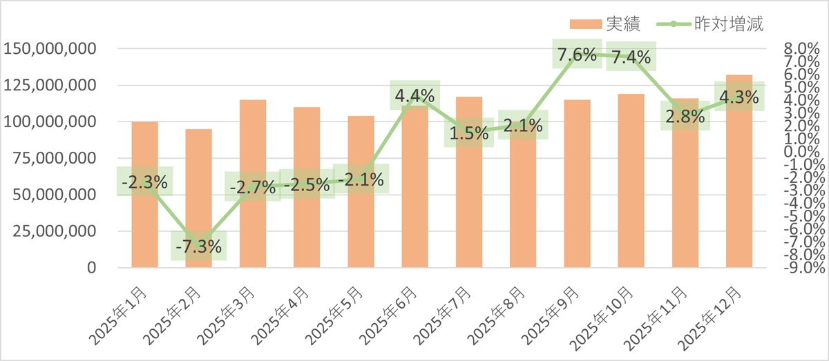 SGホールディングスが1月13日に公表したデリバリー事業の取扱個数実績によると、2025年12月の取扱個数は1億3200万個(前年同月比4.3%増)となった。このうち飛脚宅配便は1億2800万個(4.6%増)、その他300万個(6.1%減)だった。