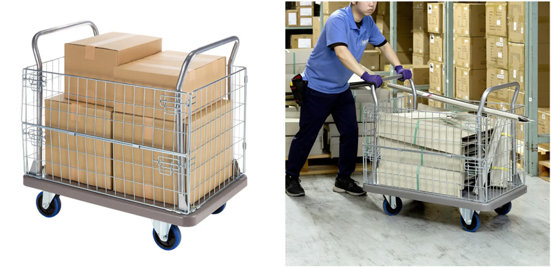 ステンレス製のカゴが付いた台車で、積荷重量約300kgに対応。太くて安定したハンドルが左右に付いており、どちら向きでもハンドルを握って移動できる。