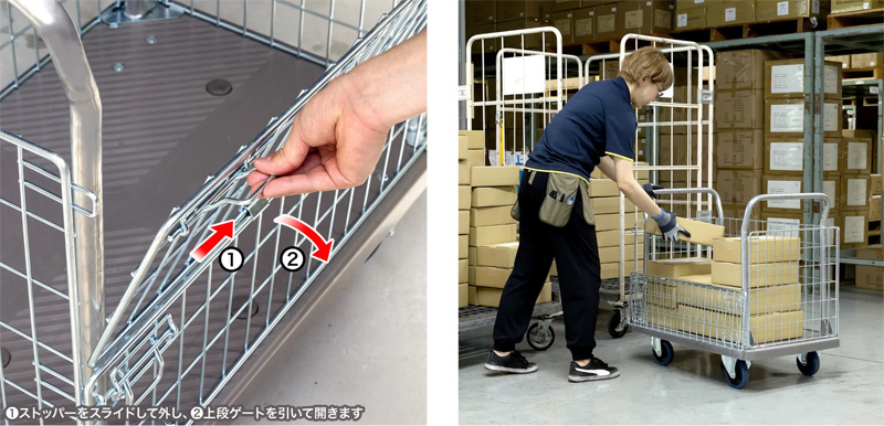 カゴ4面のうち1面は、網のストッパーを操作することで2段階の高さで開閉できる。全体を開くだけでなく半分の高さにもでき、荷物の出し入れがスムーズに行える。