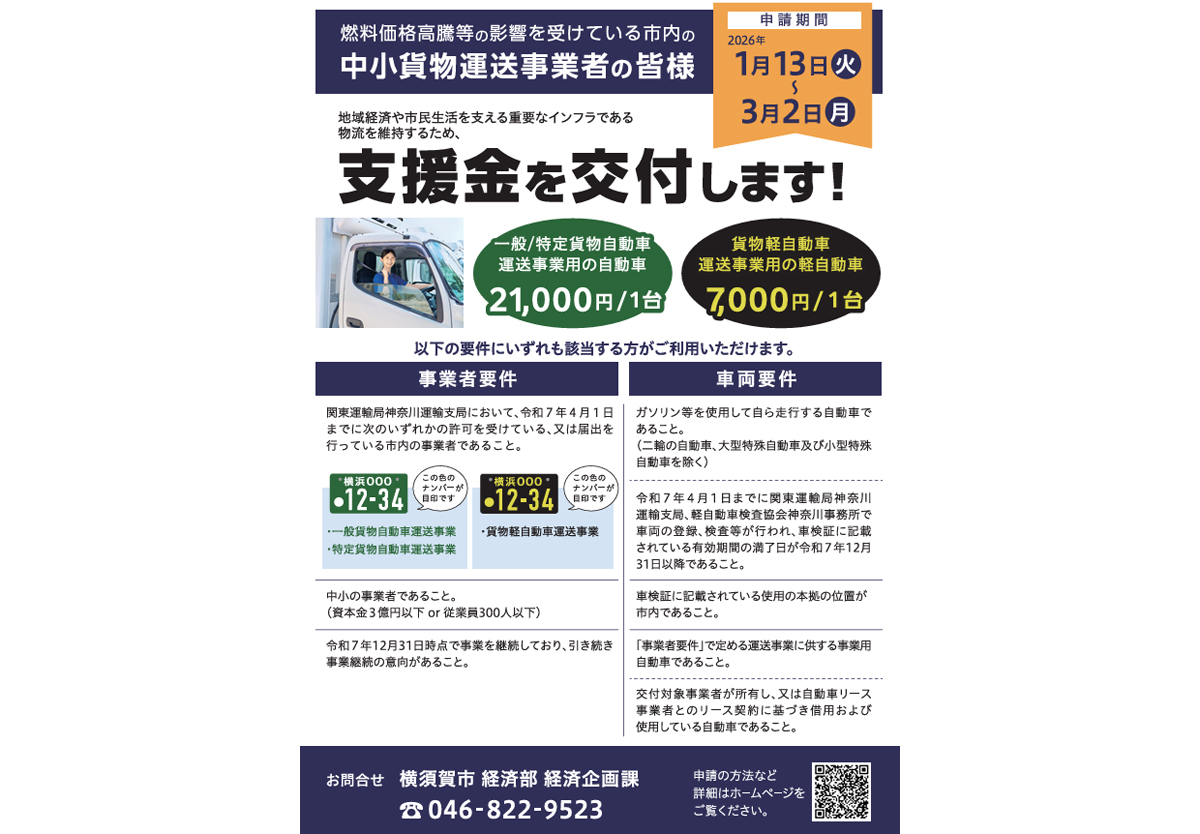 横須賀市は1月13日から、「貨物運送事業者燃料価格高騰等対策支援金」の募集を開始した。