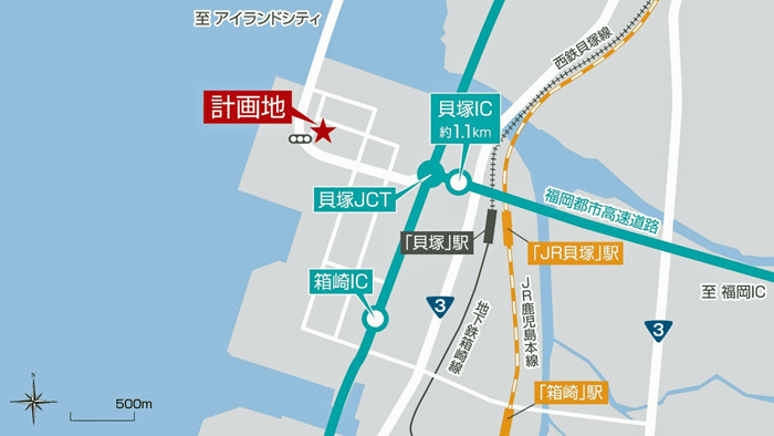 また福岡都市高速道路「貝塚IC」から約1.1kmに位置し、九州自動車道「福岡IC」を経由することで、九州全域への広域輸送が可能な物流拠点として高い需要が見込まれる。