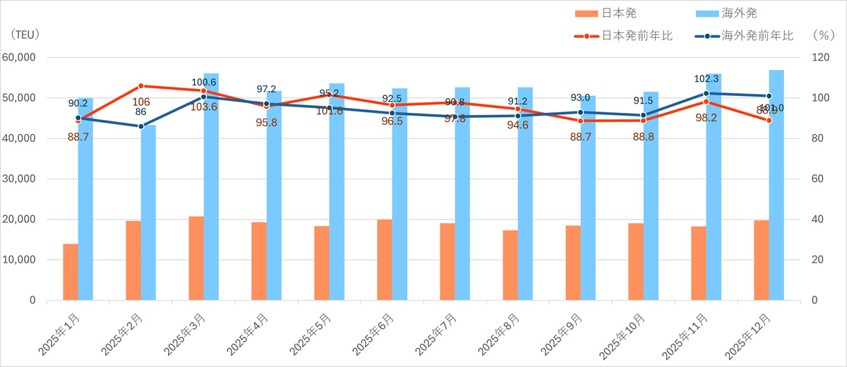 NXホールディングス(HD)が1月15日に公表した国際海上輸送取扱実績によると、2025年12月の輸出貨物数量は日本発合計が1万9777TEU(前年同月比11.1%減)、海外発合計が5万6956TEU(1.0%増)、グローバル合計が7万6734TEU(2.5%減)となった。