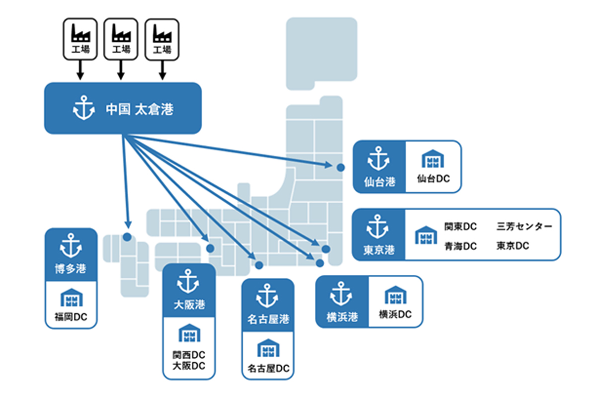 従来、商品ごと、サプライヤーごとに行っていた輸入を一挙にまとめることで、物流コストやオペレーション負荷を軽減、日本国内での輸送を抑制し、物流コストの低減と輸送効率の向上を図っていくとしている。