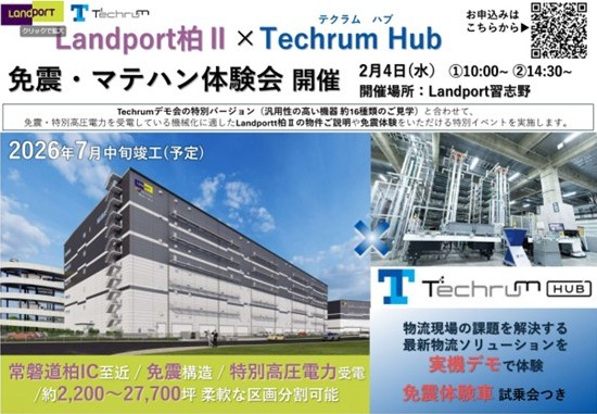 野村不動産は2月4日、千葉県「習志野Techrum Hub(テクラムハブ)」で「<免震体験付>最新物流機器の特別デモンストレーション会」を開催する。