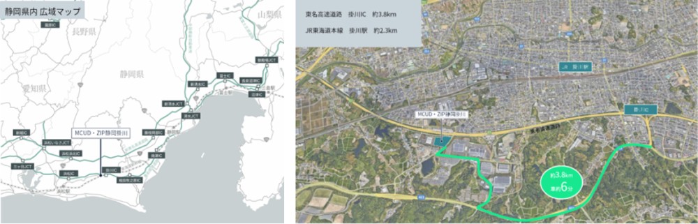 同施設は、JR東海道本線「掛川駅」約2.3km、東名高速道路「掛川IC」約3.8kmに位置し、主要幹線道路である国道1号へのアクセスもよい。