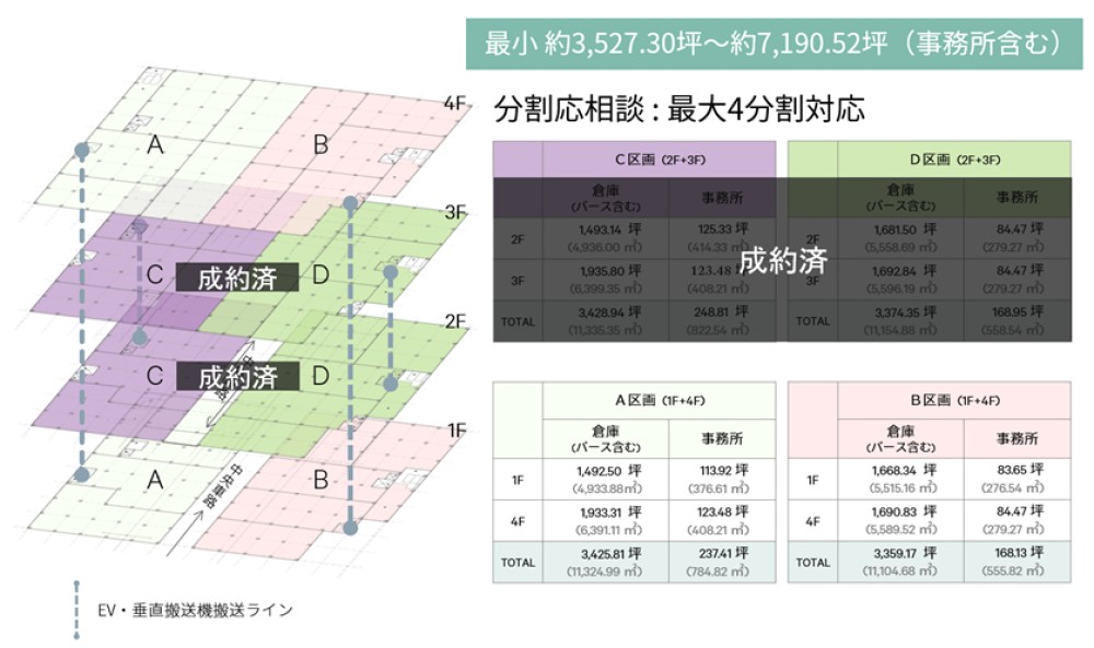 また、「最大4分割でまで分割提供が可能。半分のC・D区画については竣工前に成約済みとなっており、募集区画はA・B区画の状況」としている。