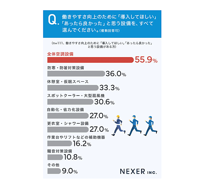 また働きやすさを高めるために「導入してほしい」設備の有無については37%が「ある」と回答。具体的な設備として最も多かったのは「全体空調設備」で、55.9%だった。