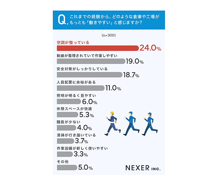 まず、倉庫や工場で働いた経験がある人に、これまでの経験を踏まえて「もっとも働きやすい」と感じた環境について調査したとこと、24.0%が最も働きやすいのは「空調が整っている」と回答した。