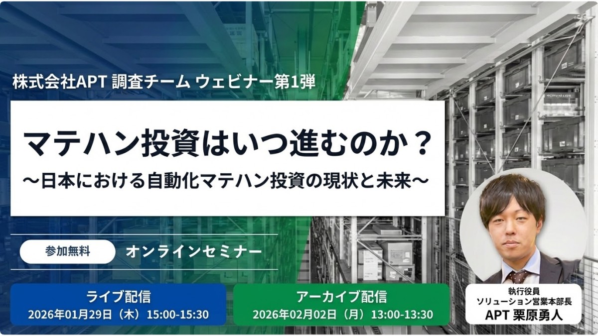 APTは1月29日、ウェビナー「マテハン投資はいつ進むのか?~日本における自動化マテハン投資の現状と未来~」をオンライン開催する。1月29日のライブ配信のほか、2月2日にアーカイブ配信も行う。