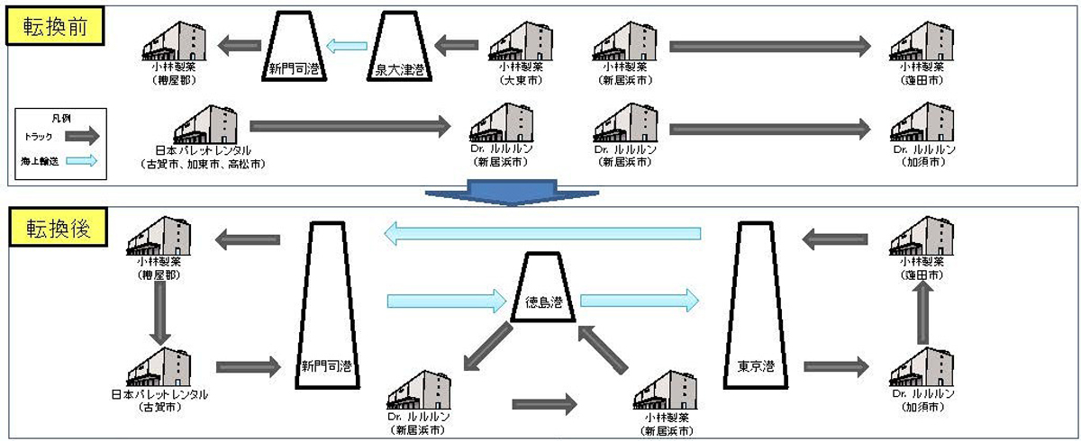 小林製薬、Dr.ルルルンの四国発関東向けの輸送では、出荷ロットが20tトレーラー単位にまとまらないと積載効率が上がらず、輸送コストの面からも陸送輸送を行わざるを得ないという課題があったことから、従来各社で手配していた陸送輸送を14mセミトレーラーに変更した上で混載することにより、コストを抑えつつ海上輸送へのシフトに成功した。