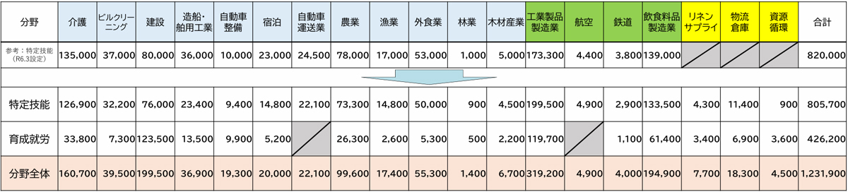 受け入れ見込み数は、上限として運用するものであるが、2024年3月の設定時より生産性向上や国内人材確保の取り組みを進めるなどして精査した結果、特定技能80万5700人、育成就労42万6200人の合計123万1900人とされた。