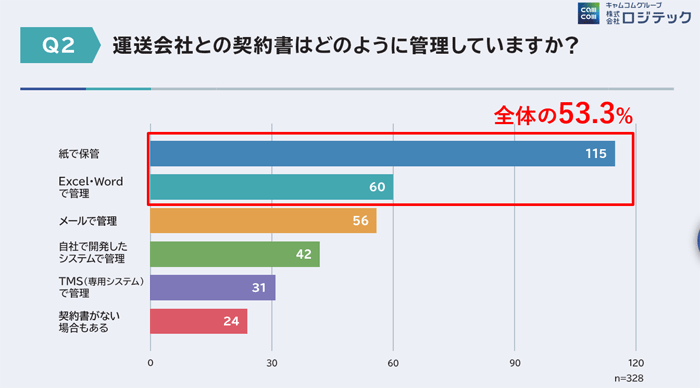 2024年に改正された物流関連二法により契約条件の明確化や取引の適正化が求めらるなか、調査結果をみると契約管理で全体の5割超が、紙やExcelによる運用に依存していることが明らかとなった。