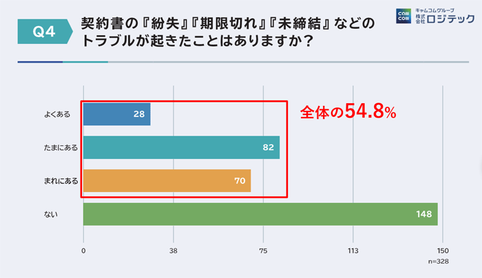 「契約条件の認識違い」「更新漏れ」「責任範囲の不明確さ」といった契約起因のトラブルを経験したことがあるか、という質問に対しては、54.8%の企業が経験していると回答。