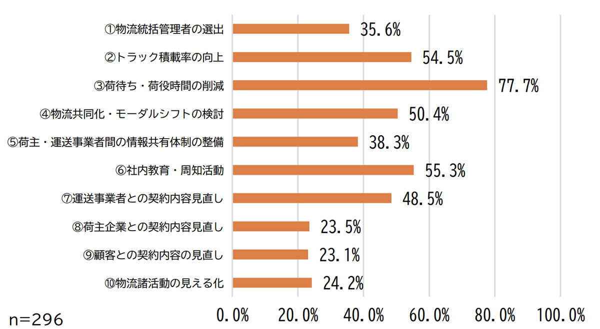 対応策については、「荷待ち・荷役時間の削減」(77.7%)が最も多く、続いて「社内教育・周知活動」(55.3%)、「トラック積載率の向上」(54.5%)となり、法改正への対応に向けて物流改善活動を活発化する企業が増えている一方で、物流統括管理者の選出(選任)は35.6%にとどまっている。