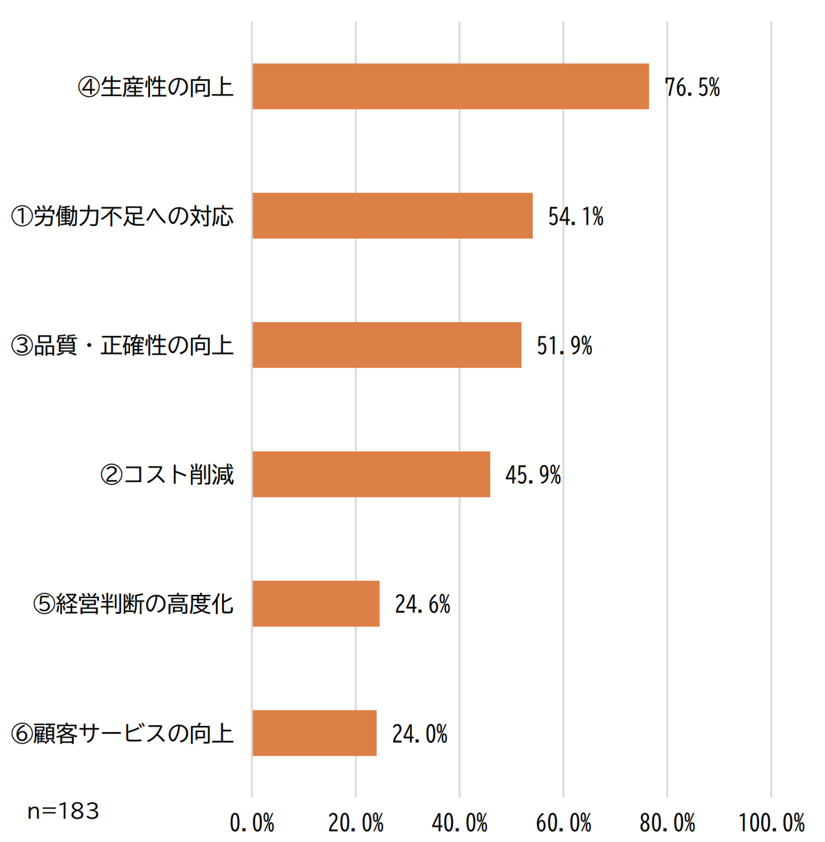 生成AIを活用する主な目的は、「生産性の向上」(76.5%)、「労働力不足への対応」(54.1%)、「品質・正確性の向上」(51.9%)が上位を占め、課題については「知見を有する人材が不足している」(66.9%)が最も多かった。
