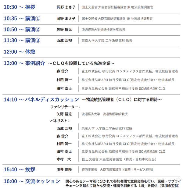 フォーラムでは、国土交通省の岡野 まさ子 大臣官房総括審議官兼物流統括調整官らによる講演や、花王、SUBARU、三菱食品の3社のCLOによる事例紹介、「CLOに対する期待」をテーマにしたパネルディスカッションなどが展開される。