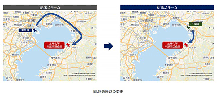 従来、市原工場周辺への輸入品陸送では東京港を主に利用していたが、千葉港へ切り替えることで、走行距離の短縮や渋滞回避によるGHG(温室効果ガス)排出量削減、トラックドライバーの拘束時間削減が可能となる。