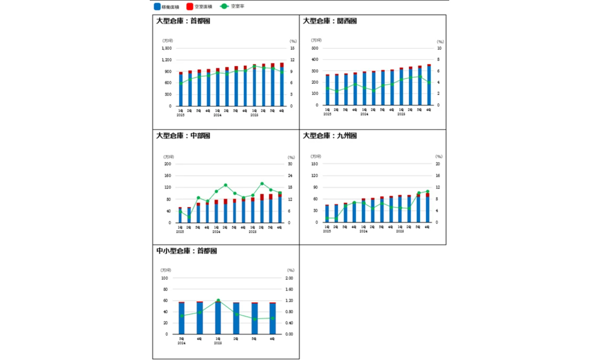 レポートは賃貸大型倉庫(1万m2)を中心に、首都圏、関西圏、中部圏、九州圏の市場動向をまとめたもの。また、賃貸中小型倉庫(3300m2未満)は、同社の管理物件を含む、一般社団法人日本倉庫マスターリース協会の協会員企業が管理する倉庫物件データを利用することで、分析精度を高めて市場動向を掲載している。