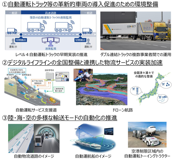 「物流全体の最適化に向けた商慣行の見直しや荷主・消費者の行動変容、産業構造の転換」では、改正物流効率化法を通じた荷主・物流事業者・消費者の連携・協力の強化や、適正運賃収受に向けた価格転嫁の円滑化、トラック適正化2法などを通じたトラック運送業界全体の構造転換の推進が盛り込まれている。