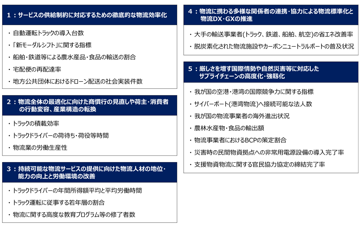 KPIについては、5つのテーマに沿って施策ごとの目標値を定め、進ちょく状況のモニタリングや推進体制の構築につなげることとし、「サービスの供給制約に対応するための徹底的な物流効率化」では、自動運転トラックの導入台数や新モーダルシフトに関する指標、「物流全体の最適化に向けた商慣行の見直しや荷主・消費者の行動変容、産業構造の転換」では、トラックの積載効率やトラックドライバーの荷待ち・荷役時間などを例に挙げた事務局案が示された。
