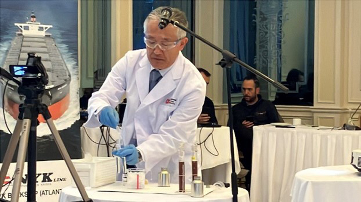 日本郵船からはグループの運航船や船主、船舶管理会社を対象とした独自の安全基準「NAV9000 Plus」の紹介や、グループ企業の日本油化工業が開発した新たな燃料添加剤などを実演も交えて説明した。