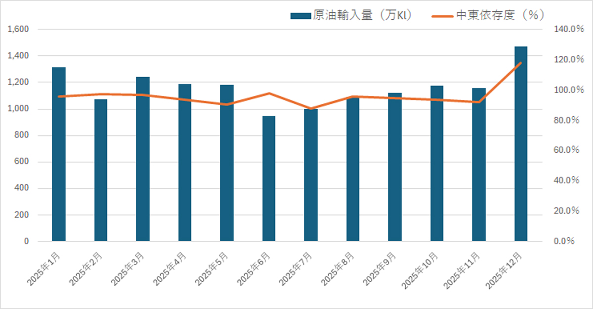 資源エネルギー庁が1月30日に発表した12月分の石油統計速報によると、原油輸入量は1473万kl(前年同月比17.7%増)と3か月連続で前年を上回った。