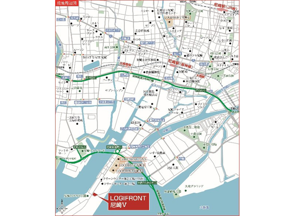 立地環境は、阪神高速道路5号湾岸線「尼崎東海岸」IC約1.8km、阪神高速道路3号神戸線「尼崎東」IC約4.5kmに位置し、複数の高速アクセスを確保できる立地。