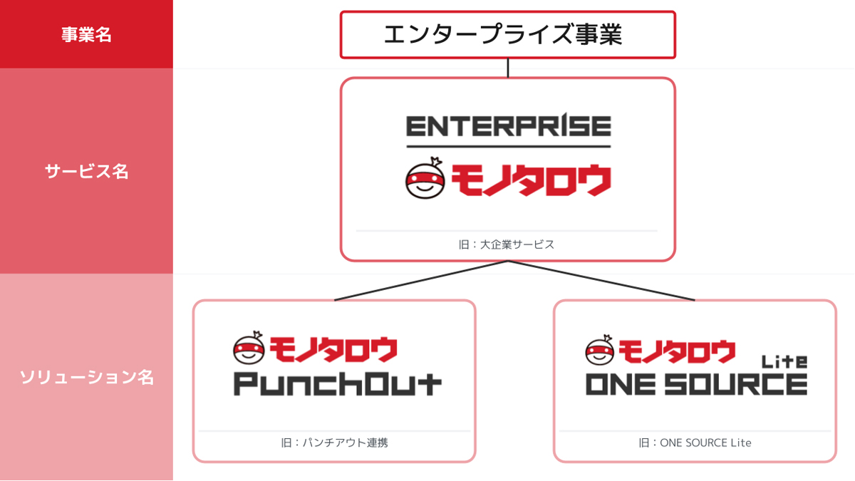 ソリューションはそれぞれ、購買管理システムを持つ顧客向けサービス「モノタロウPunchOut(パンチアウト)」(旧 パンチアウト連携)と、購買管理システムを持たない顧客でも利用できる「モノタロウ ONE SOURCE Lite(ワンソース ライト)」(旧 ONE SOURCE Lite)となる。