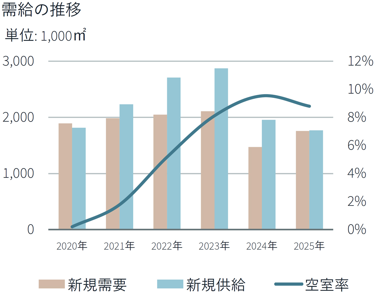 2025年第4四半期は1棟8万5000m2の新規供給となり、1棟のみの新規供給は2017年第4四半期以来8年ぶりとなった。東京圏全体の空室率は8.8%となり、前期比で0.3ポイント低下、前年同期比で0.7ポイント低下している。