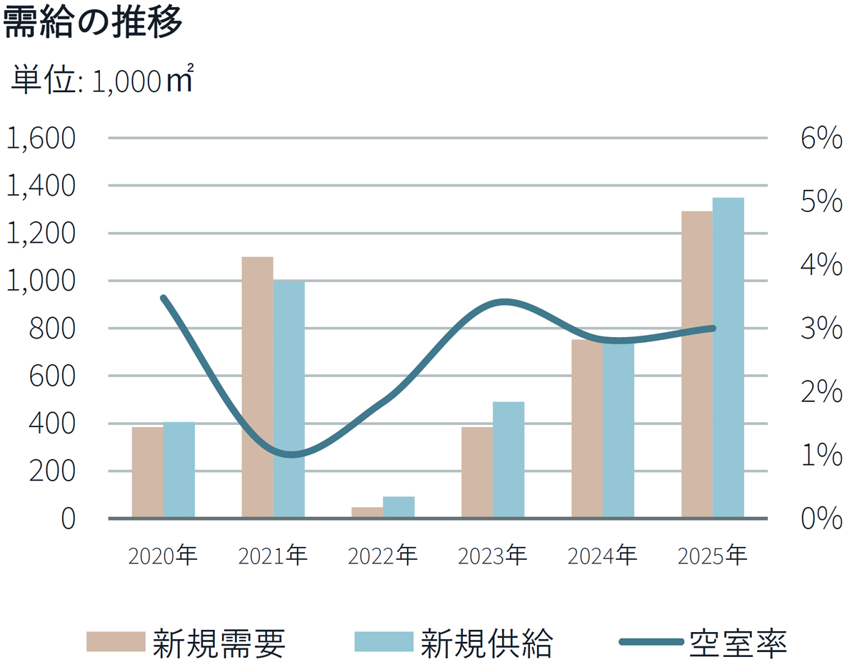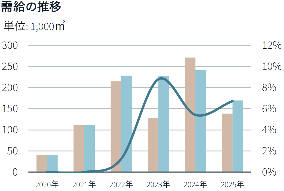 福岡マーケットでは、新規供給はなかった。一方、地場の物流企業を中心に複数の成約がみられるなど、需要面は引き続き安定している。