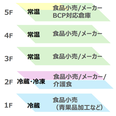 5層構造の建物は三温度帯対応となっており、1階を冷蔵、2階を冷蔵・冷凍、3~5階を常温として運用する予定で、延床面積は8万4460m2。